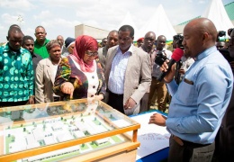 Kaimu Mganga Mkuu wa Wilaya ya Serengeti Dk. Deo Kisaka (kulia) akitoa maelezo ya mchoro sanifu wa hospitali ya Wilaya ya Serengeti kwa Makamu wa Rais, Mhe. Samia Suluhu Hassan.
