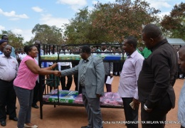 Mkuu wa Wilaya ya Serengeti, Nurdin Babu (katikati) akipokea msaada wa vitanda 15 kutoka kwa Mkuu wa Idara ya Maendeleo ya Jamii Mfuko wa Singita Grumeti Bi. Frida Mollel (kushoto)